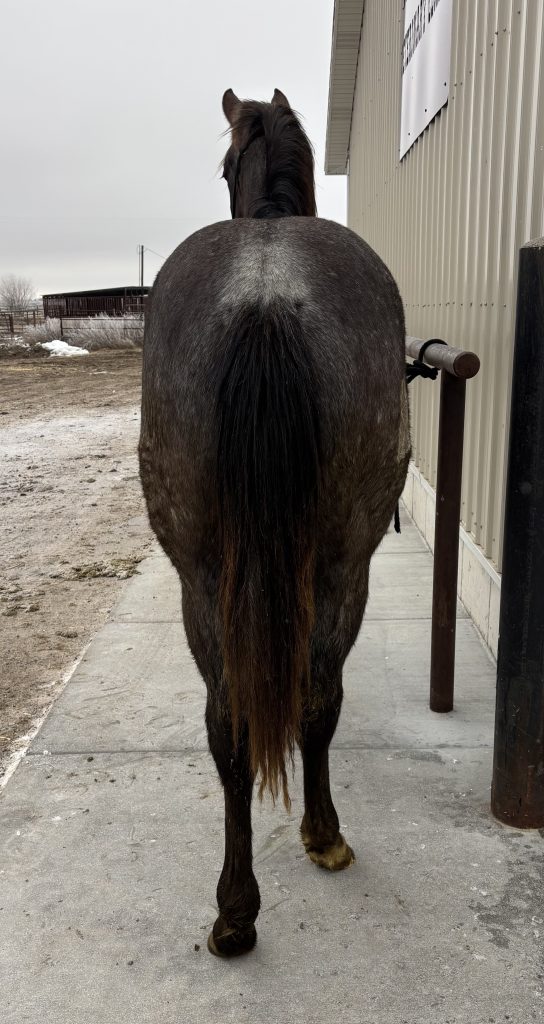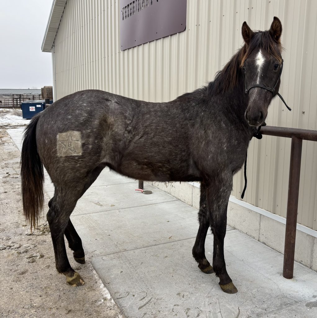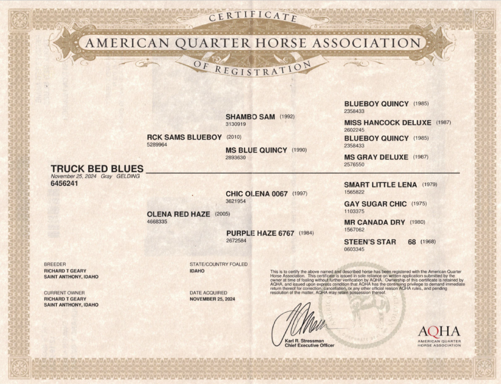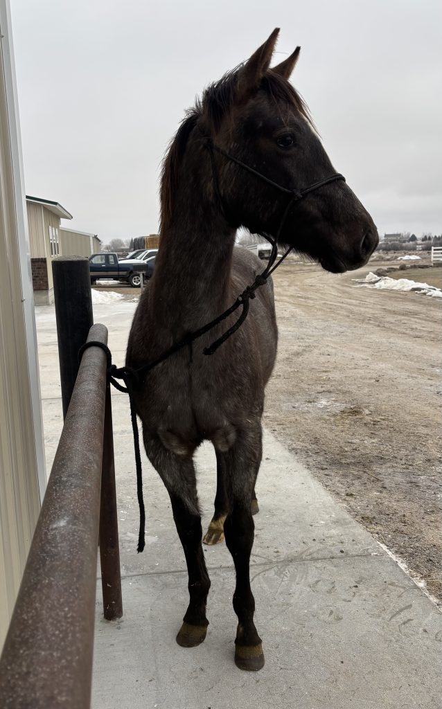 “Louie” aka Truck Bed Blues, is an AQHA registered grey colt. He is a gelded colt who is turning grey, and was born on November 25, 2024. He is out of Olena Red Haze, and by RCK Sams Blueboy. His dams side goes back to quarter horses like Smart Little Lena, Doc Bar, Three Bars, and many others! His sire goes back to Joe Quincy and Joe Hancock. This colt should make a great all around ranch horse! He is very friendly and curious. He needs some more time spent with him but we have been beginning to work with him on picking up his feet and round pen work.