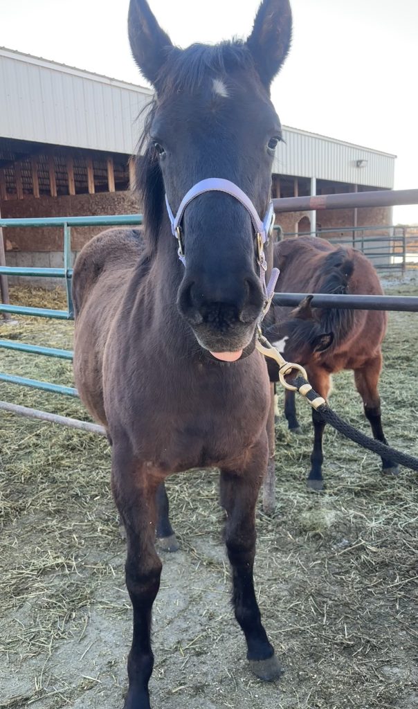 Ella is a black 2025 grade filly out of our mare Tav, and our stallion Huskys Mystery. She was born on April 18, 2025. Ella is a curious and friendly foal, and has a very laid back personality. She has been weaned and is ready to go anytime! She has been being halter broke and is beginning to work with her feet. Her sire stands at about 15 hands and is known for producing thick and well built ranch horses.